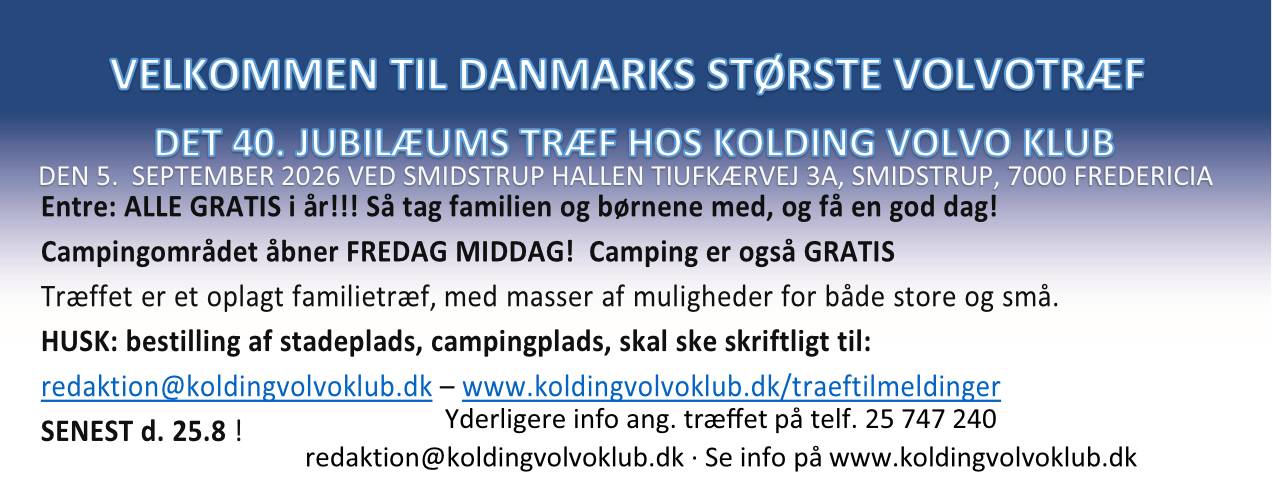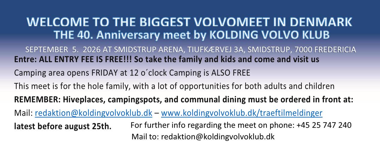 Find rundt på siden via menuen i toppen. Har du spørgsmål kan du kontakte os pr mail: kontakt@koldingvolvoklub.dk